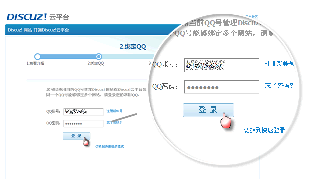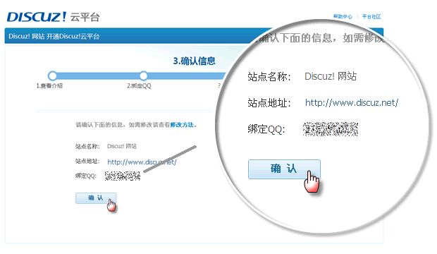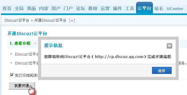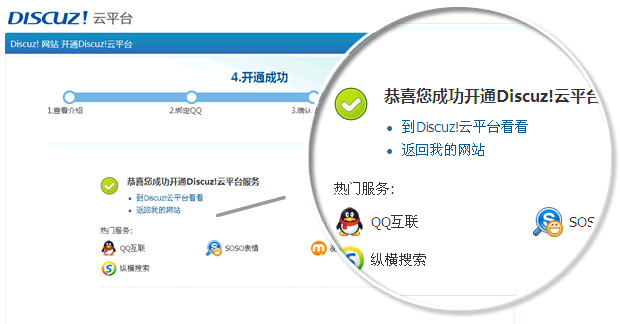 確認後,Discuz雲平台開通成功,點擊"返回我的網站"。