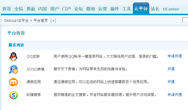 1.使用管理者帳密登入論壇後台,進入雲平台頁面,點擊"我要開通"。