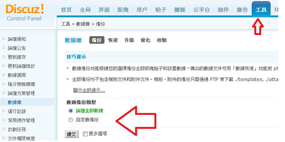 STEP1.選擇工具>數據庫>備份論壇全部數據>提交